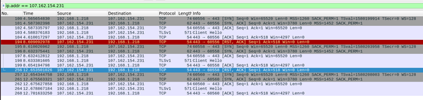 Ignore the above warning about making decisions on what you don't see, we get a RST packet, we really did expect a Server Hello instead.