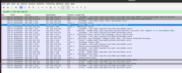 It's clear from these two captures that the TLS "Server Hello" is missing in response to the "Client Hello".2 It's tempting at this point to think maybe it is being sent but dropped before reaching my router... (MTU...?!3)
